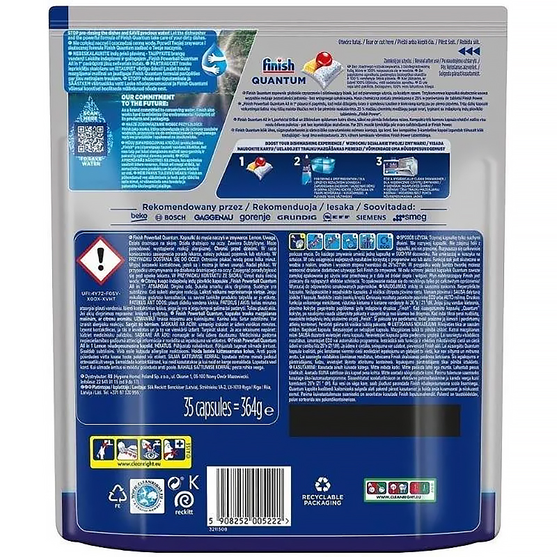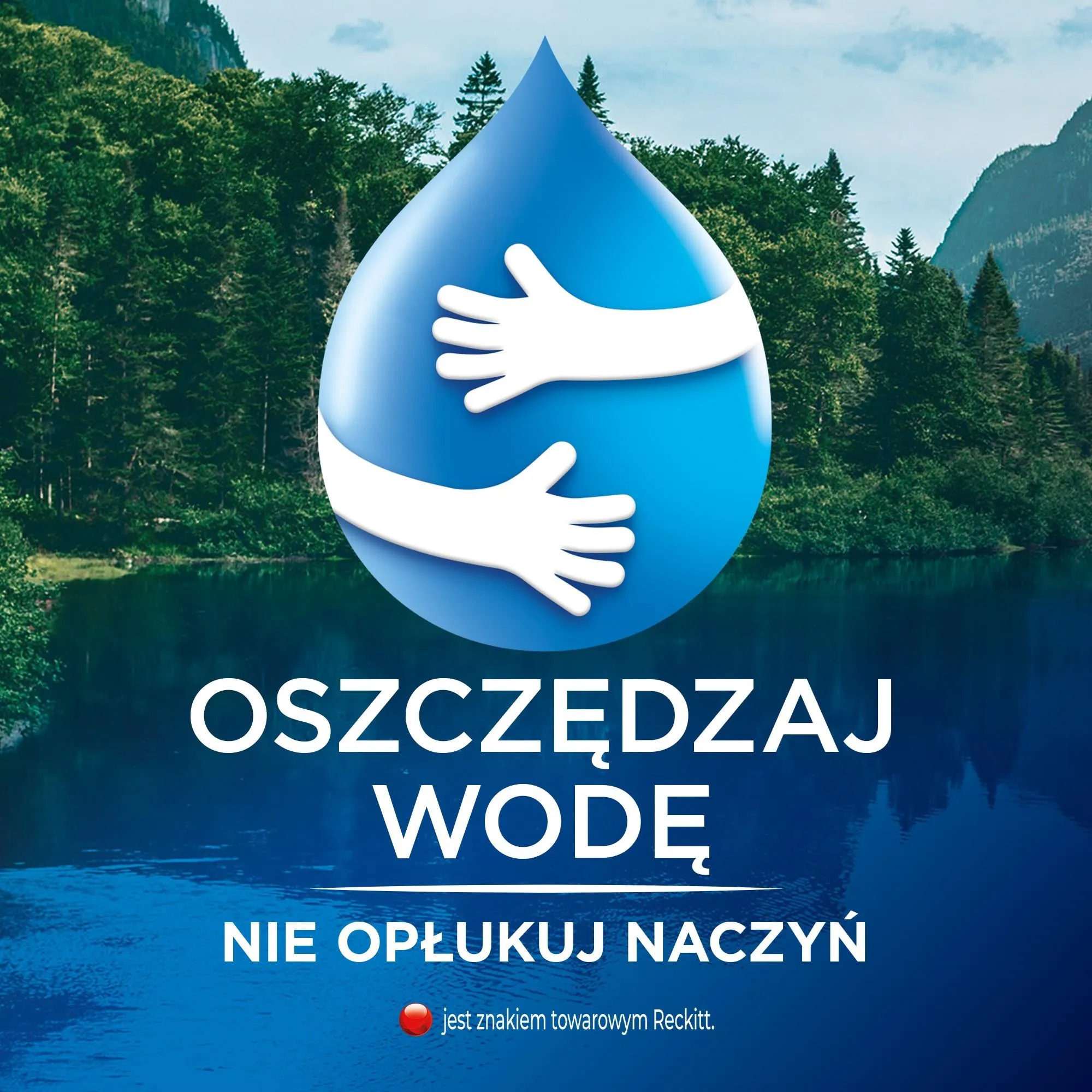 Finish Quantum ALL IN 1 działa od pierwszego cyklu mycia, rozpuszczając zaschnięte resztki jedzenia i tłuszcz nawet w niskich temperaturach. Trójkomorowa konstrukcja kapsułki łączy płynną formułę nabłyszczającą z proszkami odpowiedzialnymi za namaczanie i dokładne czyszczenie, a biodegradowalna folia szybko się rozpuszcza, uwalniając składniki aktywne we właściwym momencie. Kapsułki pomagają chronić szkło i srebro przed korozją, zapobiegają osadzaniu się kamienia w zmywarce i pozwalają zrezygnować z opłukiwania naczyń, co sprzyja oszczędzaniu wody.