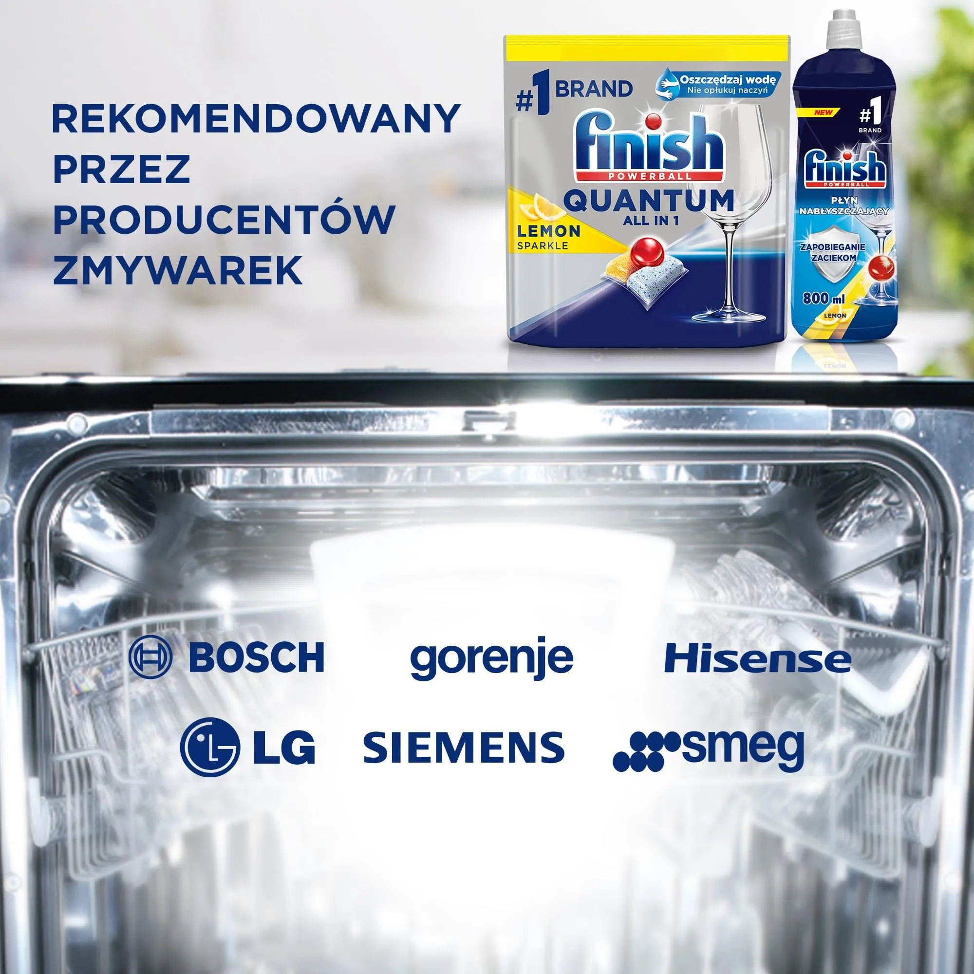 Finish Quantum ALL IN 1 to zaawansowane kapsułki do zmywarki z technologią trzech komór, które usuwają uporczywe zabrudzenia bez wstępnego spłukiwania, nadają naczyniom olśniewający połysk i chronią szkło oraz zmywarkę przed osadami kamienia.